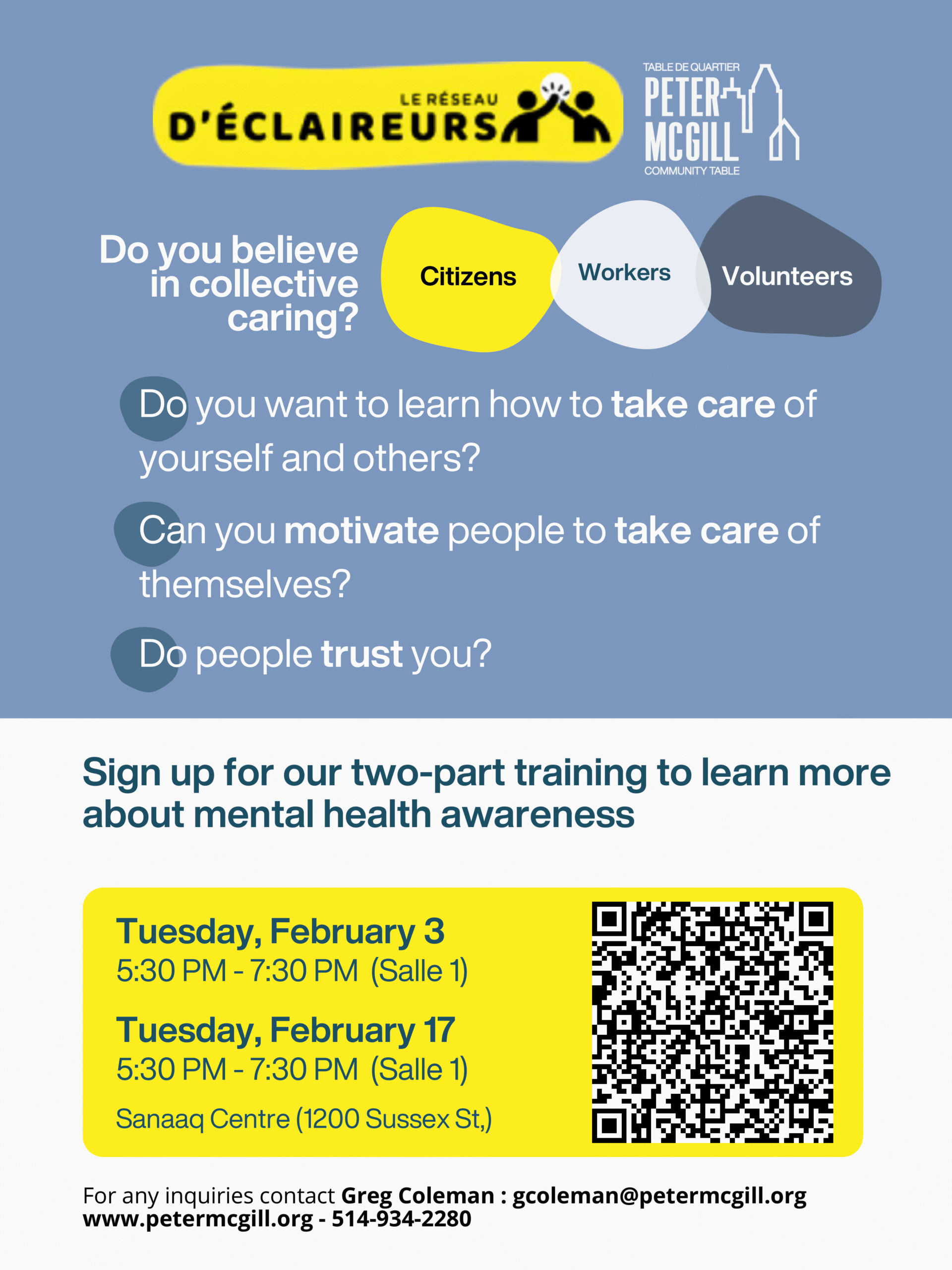 Éclaireurs training 2 + Add to Google Calendar + iCal / Outlook export Date Feb 17 2026 Time 5:30 pm - 7:30 pm Emplacement Centre Sanaaq 1200 Rue du Sussex Organisateur Table de quartier Peter-McGill Share this event